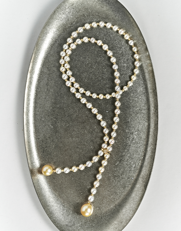 Embodies the concept of “quite luxury”. Carefully chosen sea-water pearls, diamonds and white gold and rose gold in the perfect size and proportion radiate the most delicate quality, exuding a quite and timeless charm. The necklace features an adjustable length, adding a unique touch of opulence to the entire design. This collection presents a sense of tranquility and luxury, versatile for any style and suitable for women of all ages.