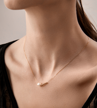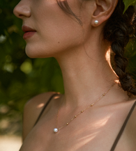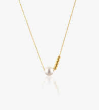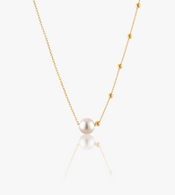 The pearl charm is elegantly suspended on a fine 18K solid gold chain, boasting a subtle yellow gold tint reminiscent of the gentle glow of candlelight. This chain promises both durability and enduring appeal, making it a timeless addition to your collection. Adorning the chain are delicate golden beads, adding intricate detail and creating a balanced aesthetic that seamlessly merges modernity with classic charm.