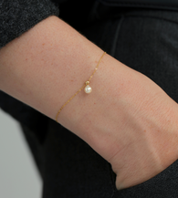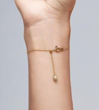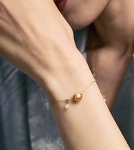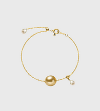 This Golden South Sea pearl bracelet features a unique trio composition—one luminous 8–9 mm or 9-10 mm Golden South Sea Pearl framed by two delicate 4.5–5 mm Akoya pearls, one of which is placed at the end of the chain. The contrast in size creates a refined focal point while preserving a sense of lightness and balance. The golden South Sea pearl is rich in color and radiates a deep, natural luster. Its organic baroque shape adds character and softens the opulence, blending classic beauty with understated elegance. Thoughtfully styled, this bracelet speaks to quiet luxury, modern simplicity, and effortless sophistication.