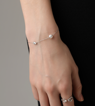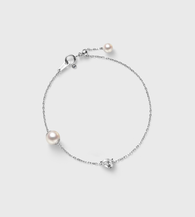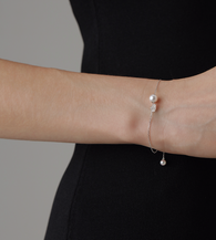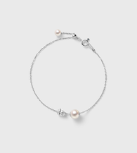 This Pearl Bracelet features two luminous AAA-grade Akoya pearls (4.5–5mm and 6.5–7mm), thoughtfully paired with a brilliant pear-cut lab-grown diamond totaling 0.37ct. Crafted in solid 14K white gold, the elegant silhouette creates a fluid, asymmetric beauty that dances along the wrist with every movement.