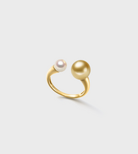 A golden South Sea pearl meets the soft glow of an Akoya pearl, creating a quiet contrast of tone and light. Set in 14K solid yellow gold, the open form feels natural on the hand — designed to be worn daily and returned to over time.