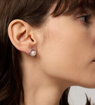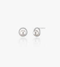These classic design pearl earrings feature hypoallergenic 925 sterling silver for comfortable wear. A circle of meticulously set zircon stones surrounds a flawless, high-luster round pearl, highlighting its beauty. Perfect for everyday wear, these earrings exude gentle elegance. Pair them with the Full Moon necklace for a cohesive and stylish set.