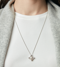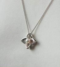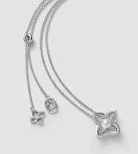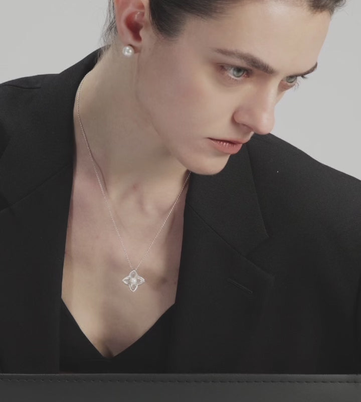 Floréa unites luminous Aurora pearls with sculpted silver in a refined quatrefoil composition, where softness meets architectural symmetry. The silver surface is finished with a delicate hand-brushed texture, lending depth and a subtle vintage character to the piece.