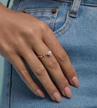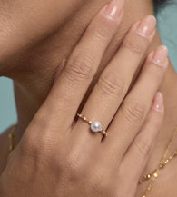 This exquisite ring features an Akoya pearl at its center, flanked by three natural diamonds on each side. The ring band showcases a graceful ridge design adorned with six additional natural diamonds of G-H color and VS1 clarity. Crafted in hypoallergenic, fade-resistant 18k gold, it offers both comfort and elegance, making it a refined piece for any collection.