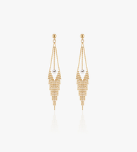 These unique earrings exude style and sophistication. Handcrafted with meticulous attention to detail, each small round bead reflects light beautifully. The 4mm suspended pearl adds a touch of softness and elegance. The overall design is fashionable, flattering to the face, and the line of gold beads forms a delicate curtain that moves gracefully. Perfect for adding a sense of grandeur when needed, these earrings are both versatile and chic.