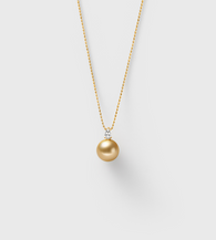 This pearl necklace showcases AAAA-grade 9–10mm Golden South Sea pearl, glowing with a warm, tropical radiance that embodies rare luxury. Each pearl is carefully selected for its round shape and exceptional luster, paired with 18K solid gold and a 0.15ct pear-shaped lab-grown diamond that highlight the pearls’ noble brilliance and fine craftsmanship.