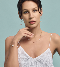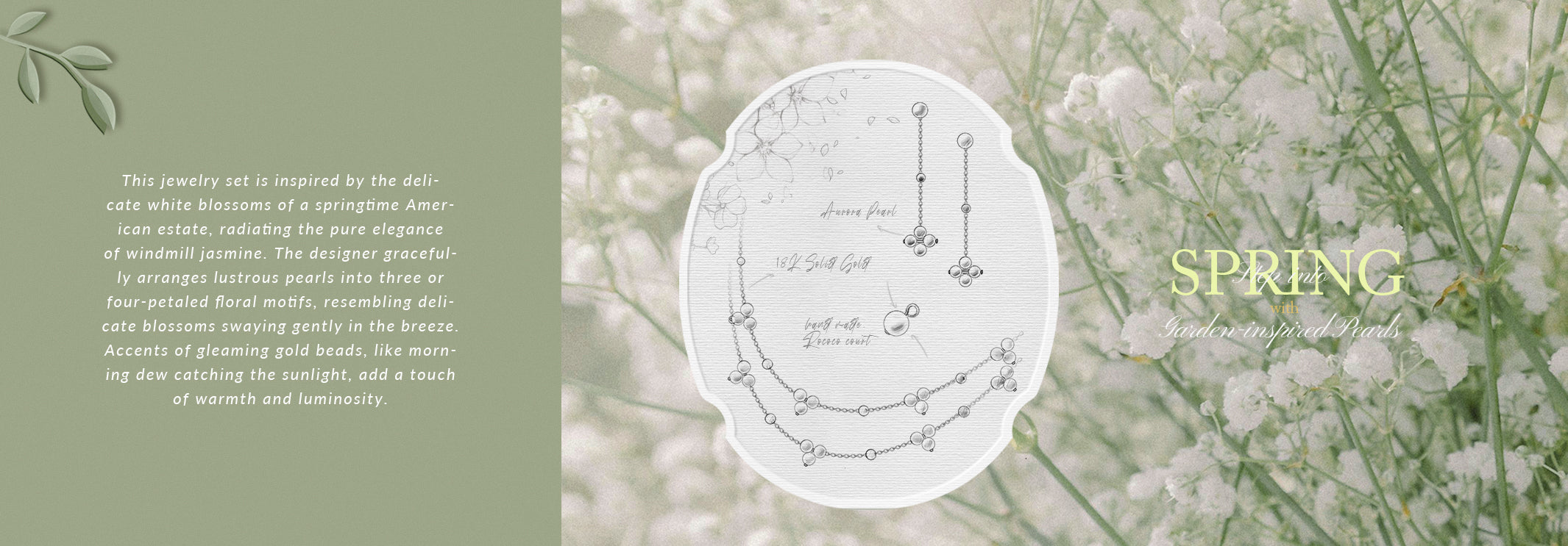 This jewelry set is inspired by the delicate white blossoms of a springtime American estate, radiating the pure elegance of windmill jasmine. The designer gracefully arranges lustrous pearls into three or four-petaled floral motifs, resembling delicate blossoms swaying gently in the breeze. Accents of gleaming gold beads, like morning dew catching the sunlight, add a touch of warmth and luminosity.