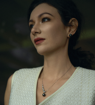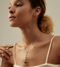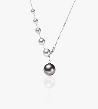 The striking Celestial Cascade necklace features one 10-11mm Tahitian black pearl, paired with five Japanese seawater Akoya pearls. High-quality Tahitian pearls are scarce in production, with those larger than 10mm being exceptionally rare. The pearl we've chosen for this design has a densely layered, thick nacre, a strong luster, a large size, and a round shape. It's an outstanding investment piece in the realm of pearls.