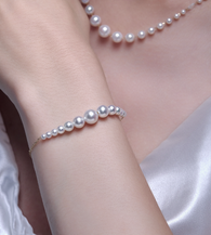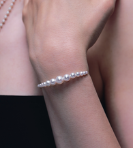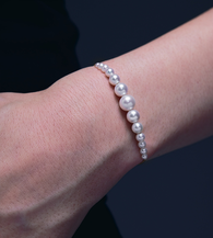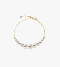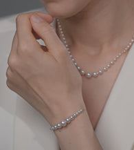 This pearl bracelet reimagines minimal structure with radiant detail. At the center, AAA grade Aurora pearls gently graduate from 3-7.5mm, forming a soft taper that expands outward like a halo of light. A 0.21ct lab-grown teardrop diamond is suspended at the end, catching the light with every movement, like a dewdrop gliding at your wrist.