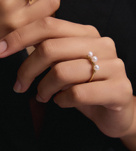 This refined ring features three Akoya pearls, with a natural diamond elegantly set at the center. The diamond boasts G-H color and VS1 clarity, adding a touch of brilliance. Crafted in hypoallergenic, fade-resistant 18k gold, this piece ensures comfort and durability. Perfect for stacking, it brings a high level of style and sophistication to any look.
