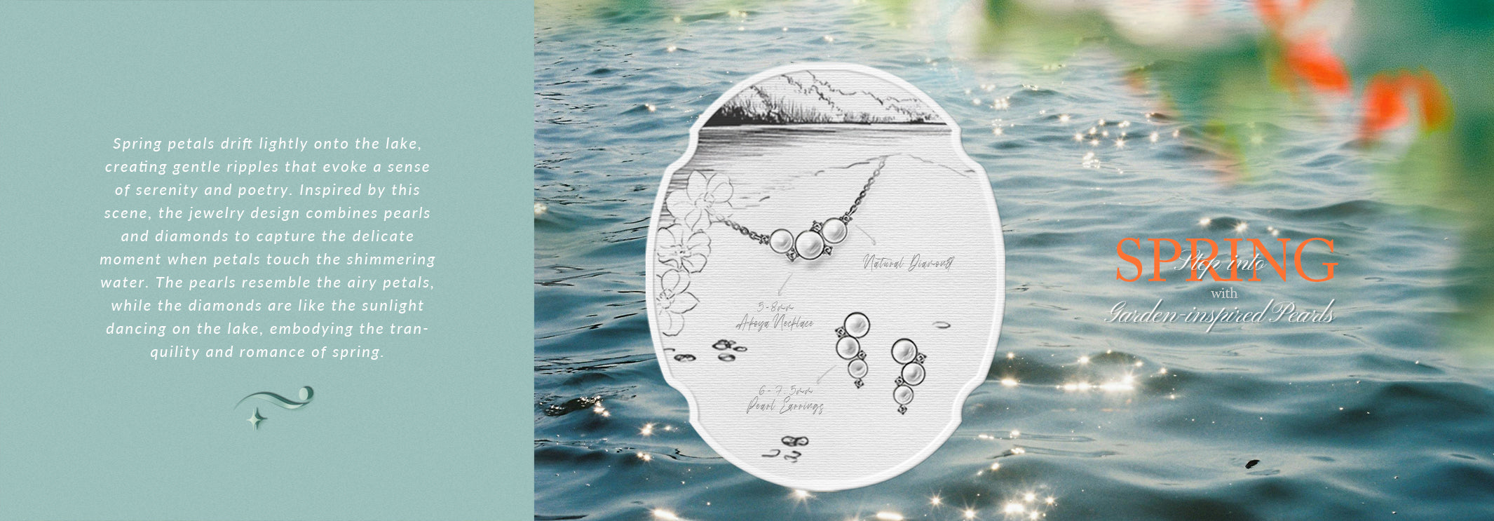 Spring petals drift lightly onto the lake, creating gentle ripples that evoke a sense of serenity and poetry. Inspired by this scene, the jewelry design combines pearls and diamonds to capture the delicate moment when petals touch the shimmering water. The pearls resemble the airy petals, while the diamonds are like the sunlight dancing on the lake, embodying the tranquility and romance of spring.